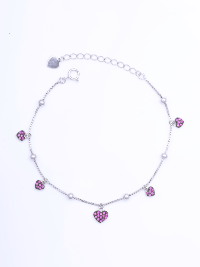 ₹2,599.00Original price was: ₹2,599.00.₹1,669.00Current price is: ₹1,669.00.This is a sterling‑silver bracelet featuring five heart‑shaped charms spaced evenly along a delicate silver chain. Each heart is pave‑set with pink gemstones that give a sparkling pink fill. Small silver beads separate the hearts for extra detail. The bracelet is adjustable in size and uses a claw‑type clasp with a tiny heart‑shaped pull‑tab for secure closure.- SKU ID - KJBR0005