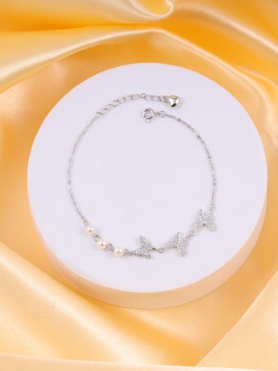 ₹4,199.00Original price was: ₹4,199.00.₹2,449.00Current price is: ₹2,449.00.This bracelet is a sleek sterling silver butterfly charm piece with a zircon‑studded butterfly motif and pearl accents. The design features three silver butterfly charms set with sparkling zircon stones, spaced between small white pearls along the chain. It has an adjustable chain with a clasp for easy sizing.- SKU ID - KJBR000012