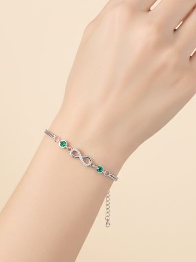 ₹2,999.00Original price was: ₹2,999.00.₹2,499.00Current price is: ₹2,499.00.It’s a sleek sterling‑silver dual‑chain bracelet with an adjustable extension and a claw‑type clasp for secure closure. The centerpiece is an infinity‑shaped charm of polished silver inlaid with tiny zircon stones that sparkle subtly. On either side of the infinity charm are two round, bezel‑set green gemstones that give a bright pop of color. The overall design mixes elegance and symbolism, blending silver, zircon shine, and green accents.- SKU ID - KJBR0004