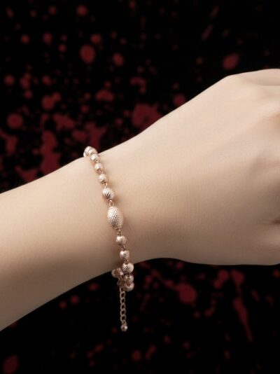 ₹6,999.00Original price was: ₹6,999.00.₹3,149.00Current price is: ₹3,149.00.This bracelet is a rose gold–finished sterling silver accessory featuring textured spherical beads linked together in an elegant chain. The design includes a small extension chain with a lobster‑claw clasp for adjustable fitting. It’s a stylish piece perfect for parties or special occasions, adding a touch of glam to any outfit.- SKU ID - KJBR0015
