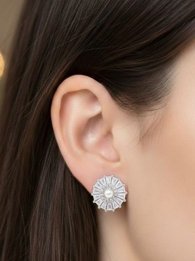 ₹1,899.00Original price was: ₹1,899.00.₹1,769.00Current price is: ₹1,769.00.These are elegant sterling‑silver stud earrings shaped like a sun rays. Each earring features a central pearl surrounded by a circle of small zircon stones, and radiating outwards are baguette‑cut zircon stones arranged in a circular pattern, giving a sparkling, floral effect. The silver setting holds the stones securely with tiny prongs. They’re perfect for a date or party because they add a touch of glamour and sophistication.- SKU ID- KJER2364