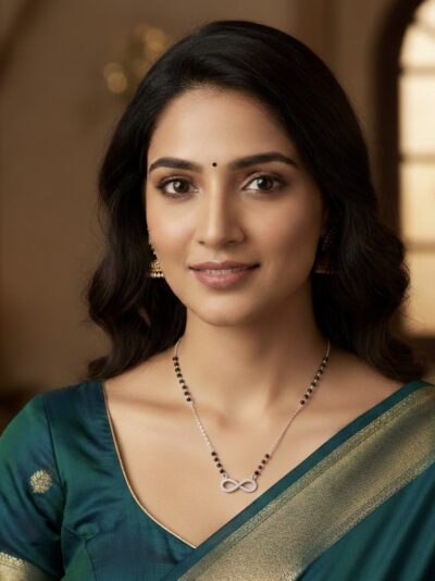 ₹6,199.00Original price was: ₹6,199.00.₹2,599.00Current price is: ₹2,599.00.This mangalsutra is crafted from 925 sterling silver, featuring a sleek chain strung with evenly spaced black beads that run on both sides of the necklace. The focal point is an infinity‑shaped pendant set with tiny, sparkling zirconia or diamond‑like stones, giving it a luminous, modern twist. The design blends traditional ethnic elegance with contemporary style, making it versatile enough to pair with both classic outfits (like sarees or lehenga) and modern ensembles. The black beads add a subtle contrast to the shiny silver, enhancing the overall aesthetic and giving the piece a sophisticated, timeless look.- SKU ID - KJMSR003