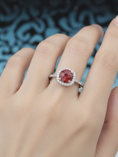 ₹2,799.00Original price was: ₹2,799.00.₹1,599.00Current price is: ₹1,599.00.The ring is a sterling‑silver setting with a round‑shaped, bright red gemstone (likely a ruby or red zircon) at its center. The central stone is surrounded by a halo of small, brilliant white zirconia that accentuate the red gem. The band is slender and also set with tiny zirconia that run along its shoulders, adding extra sparkle. The overall design gives a classic, elegant look with a pop of vivid red color- SKU ID- KJRG1475