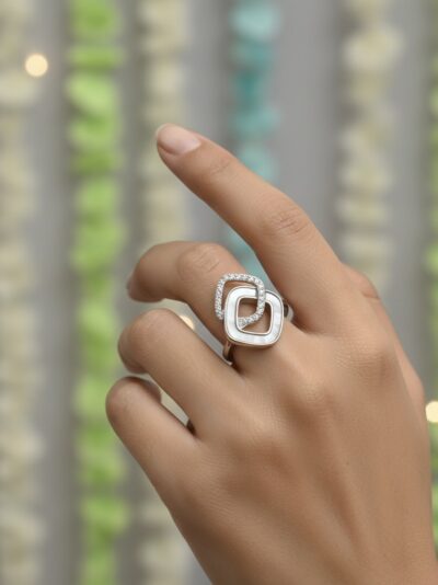 ₹3,299.00Original price was: ₹3,299.00.₹1,811.00Current price is: ₹1,811.00.The sleek sterling‑silver ring that’s a total vibe for both date night glam and everyday work wear. It’s built with two interlocking square‑shaped frames: the top one is paved with tiny sparkling zircon stones that run along its edge, giving it a chic, eye‑catching shine, while the bottom frame is a smooth, matte silver square that adds a modern, geometric touch. The double‑loop design makes the piece versatile—bold enough to stand out on a night out, yet refined and professional enough to slip into the office without missing a beat. The silver band is simple and comfortable (in adjustable size), letting the diamond‑accented top steal the show.- SKU ID- KJRG1470