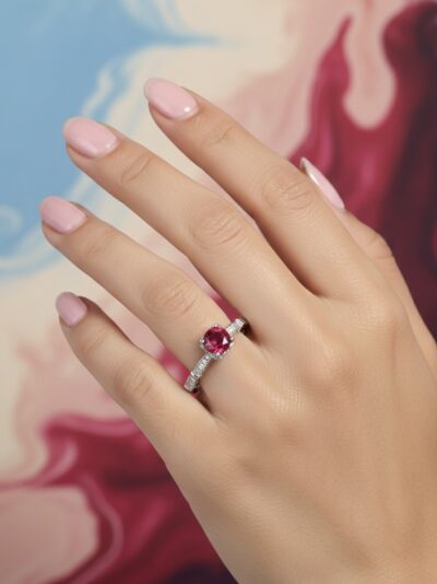 ₹3,609.00Original price was: ₹3,609.00.₹1,949.00Current price is: ₹1,949.00.This ring is a sleek sterling‑silver band set with a bright, round red gemstone (Ruby Stone) at its centre, surrounded by a four‑prong bezel. The shank is adorned with small, sparkling accent stones (cubic zirconia) on either side of the centre stone, adding extra shine. The design makes it perfect for a party or date night, giving a bold, elegant look with a pop of red colour that catches the eye.- SKU ID- KJRG1471