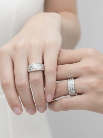 ₹6,999.00Original price was: ₹6,999.00.₹4,849.00Current price is: ₹4,849.00.These are a pair of matching 925 sterling‑silver couple rings with an adjustable size setting. Each ring features three parallel grooves set with sparkling white zirconia stones that run across the front, giving a sleek, three‑line sparkle effect. The bands are designed to be adjustable, so they can fit various finger sizes comfortably. The minimalist, modern style makes them perfect for everyday wear or as a symbolic couple’s accessory- SKU ID- KJRG1469