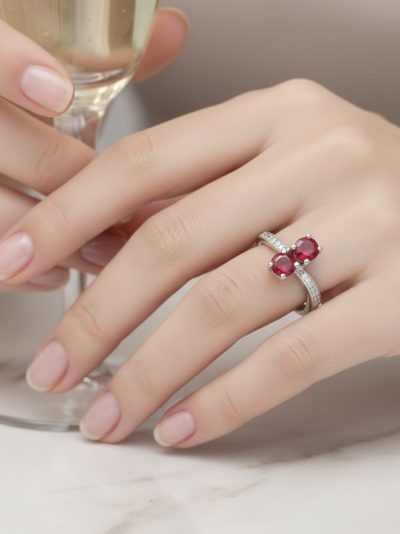 ₹2,799.00Original price was: ₹2,799.00.₹2,199.00Current price is: ₹2,199.00.The ring is a sterling silver band set with two round, bright pink ruby gemstones positioned side‑by‑side in the center, forming a double‑stone motif. The shoulders of the ring are lined with small, clear zircon stones that add sparkle along the silver shank. The design gives a elegant, dual‑gem look with zircon accents enhancing the overall brilliance.- SKU ID- KJRG1479