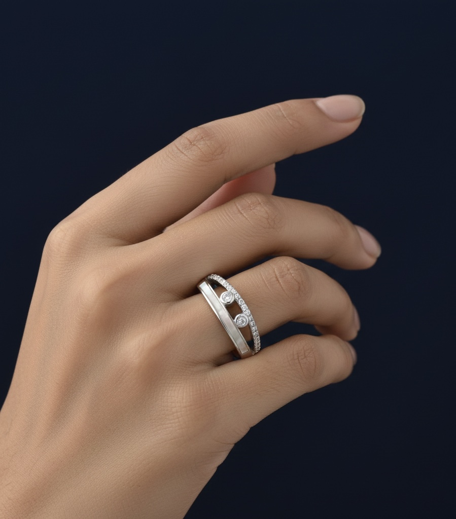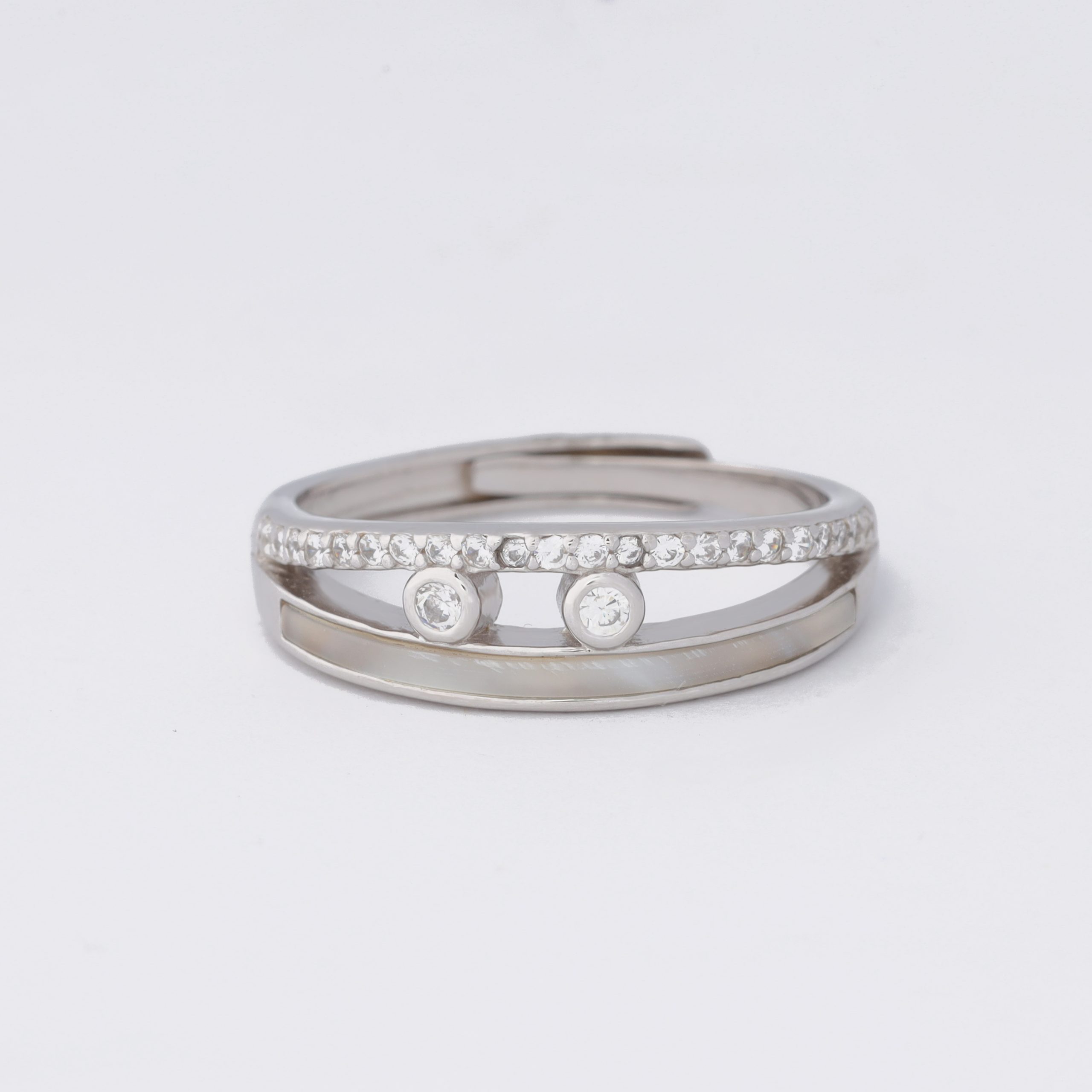 The ring is a sterling silver, adjustable-size band featuring two parallel silver strips. The middle space has two bezel-set round diamonds positioned side by side, while the outer strip on one side is lined with small, channel-set diamonds running along its length. The design gives a sleek, modern look with a touch of sparkle.