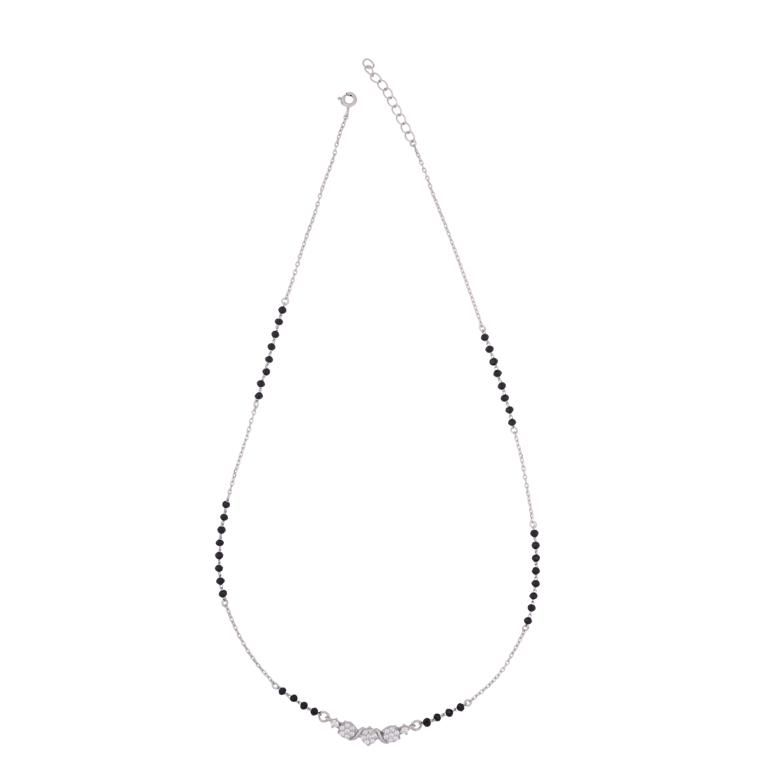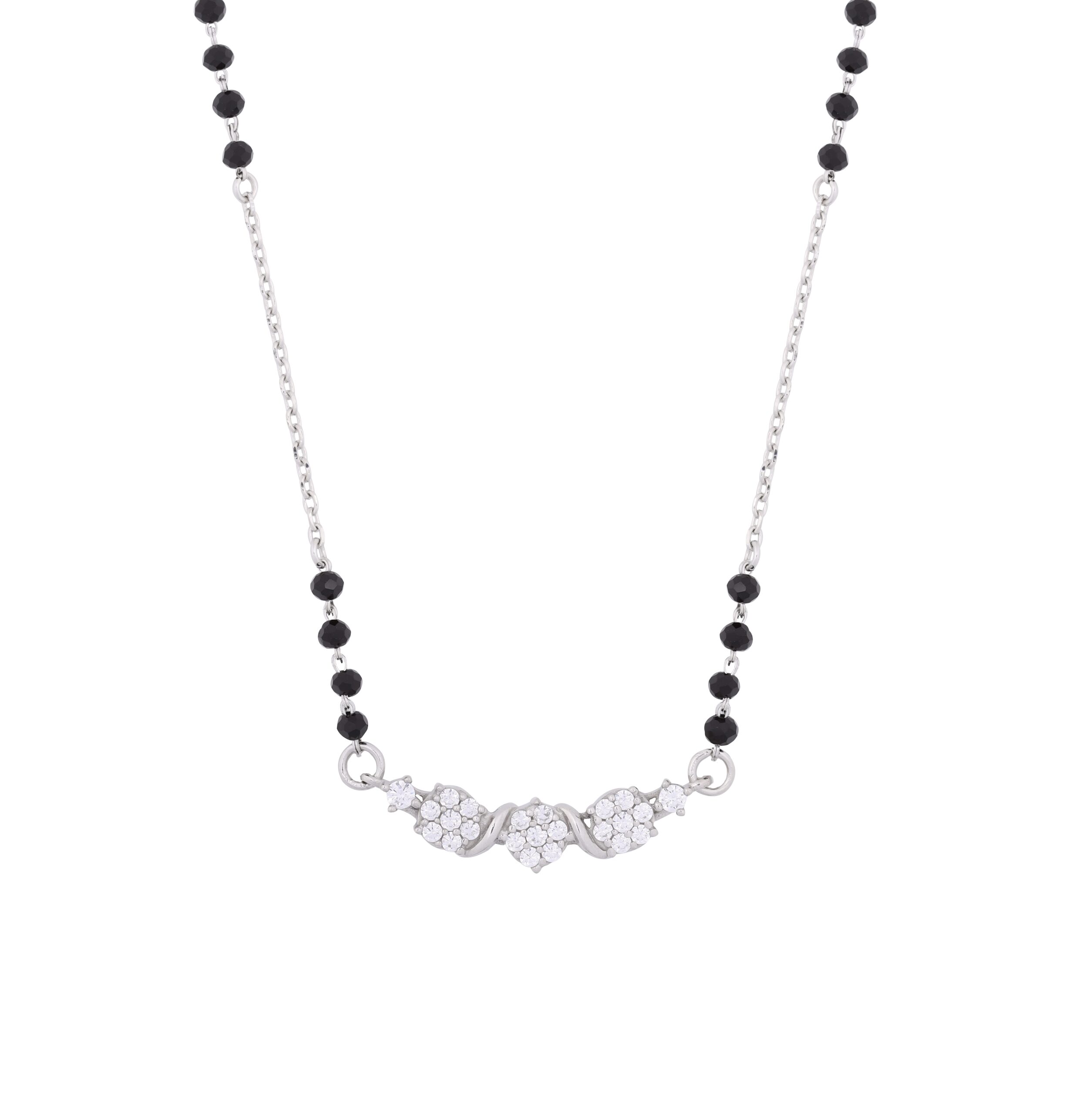This mangalsutra features a sleek sterling‑silver chain interspersed with polished black beads on both sides, leading to a central pendant shaped like an infinity‑style bow. The bow is intricately set with sparkling white zirconia stones that give it a luminous, elegant finish. The design blends traditional mangalsutra symbolism with a modern, minimalist aesthetic, using silver craftsmanship and contrasting black‑white gemwork for a stylish, contemporary look.