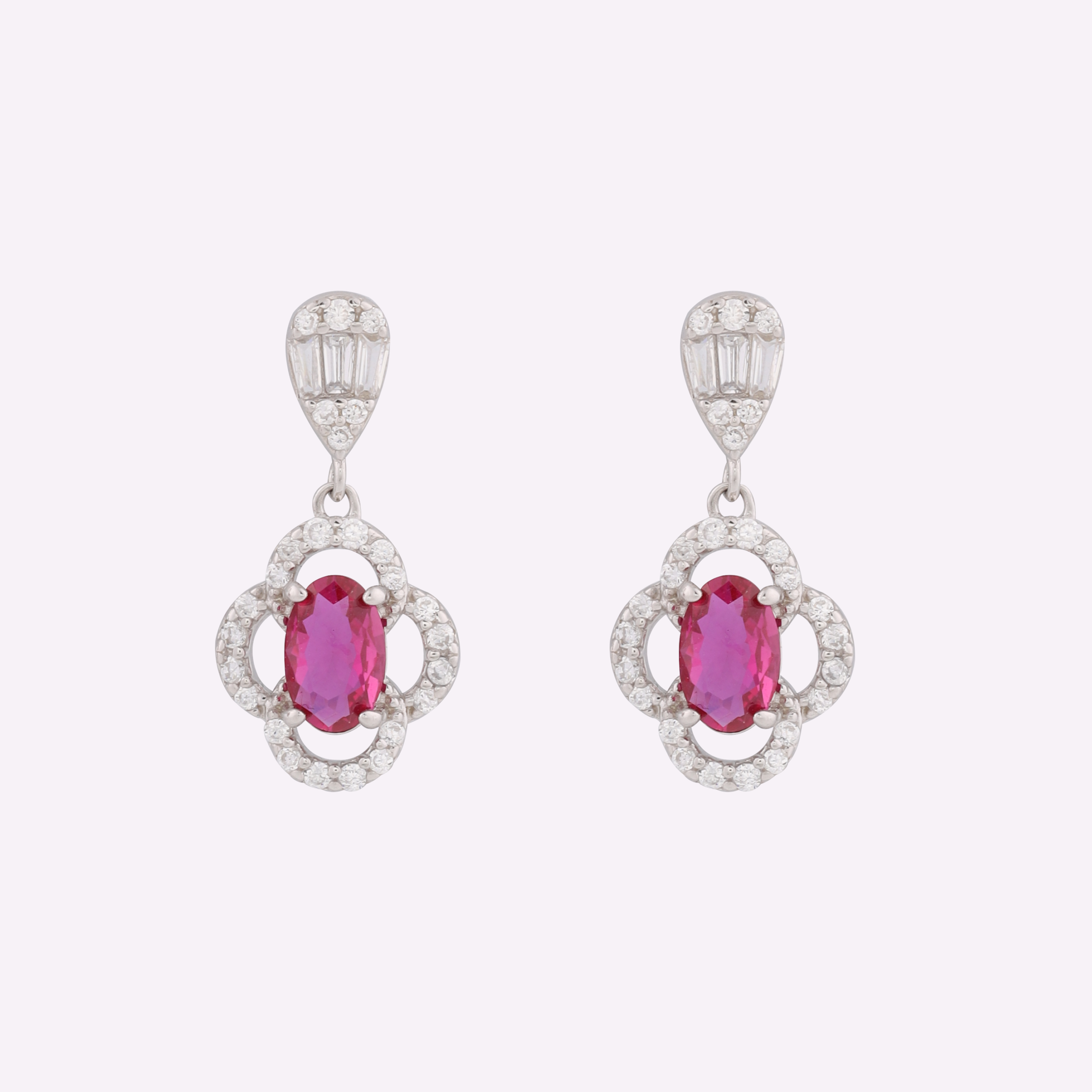 A pair of silver earrings with matching bracelet with pink oval gemstones encircled by diamonds, topped with a small crystal detail.