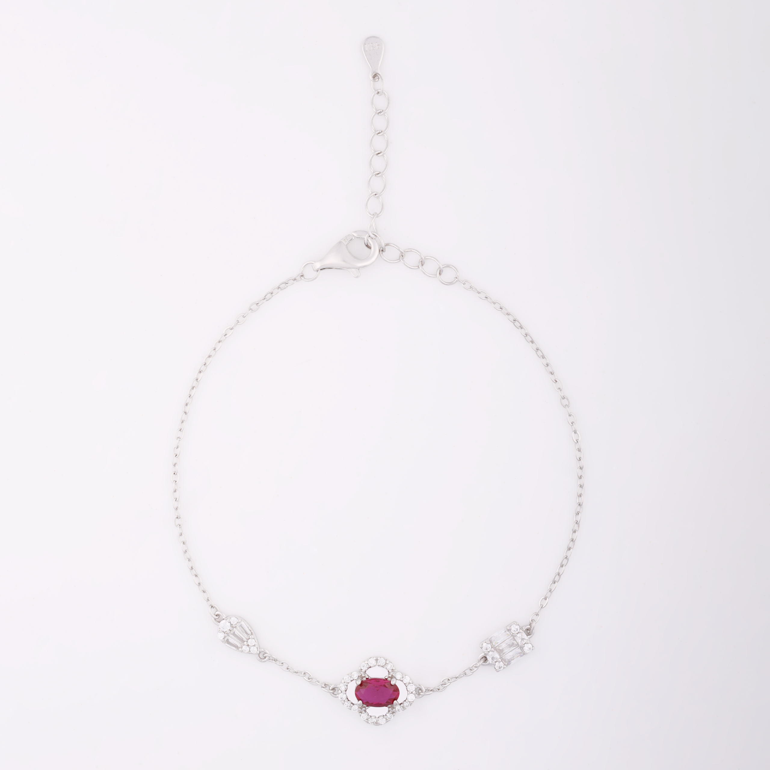 Both silver chains with diamond‑accented crystal pendants—two with baguette‑cut clear stones and one with an oval pink gemstone surrounded by small diamonds.