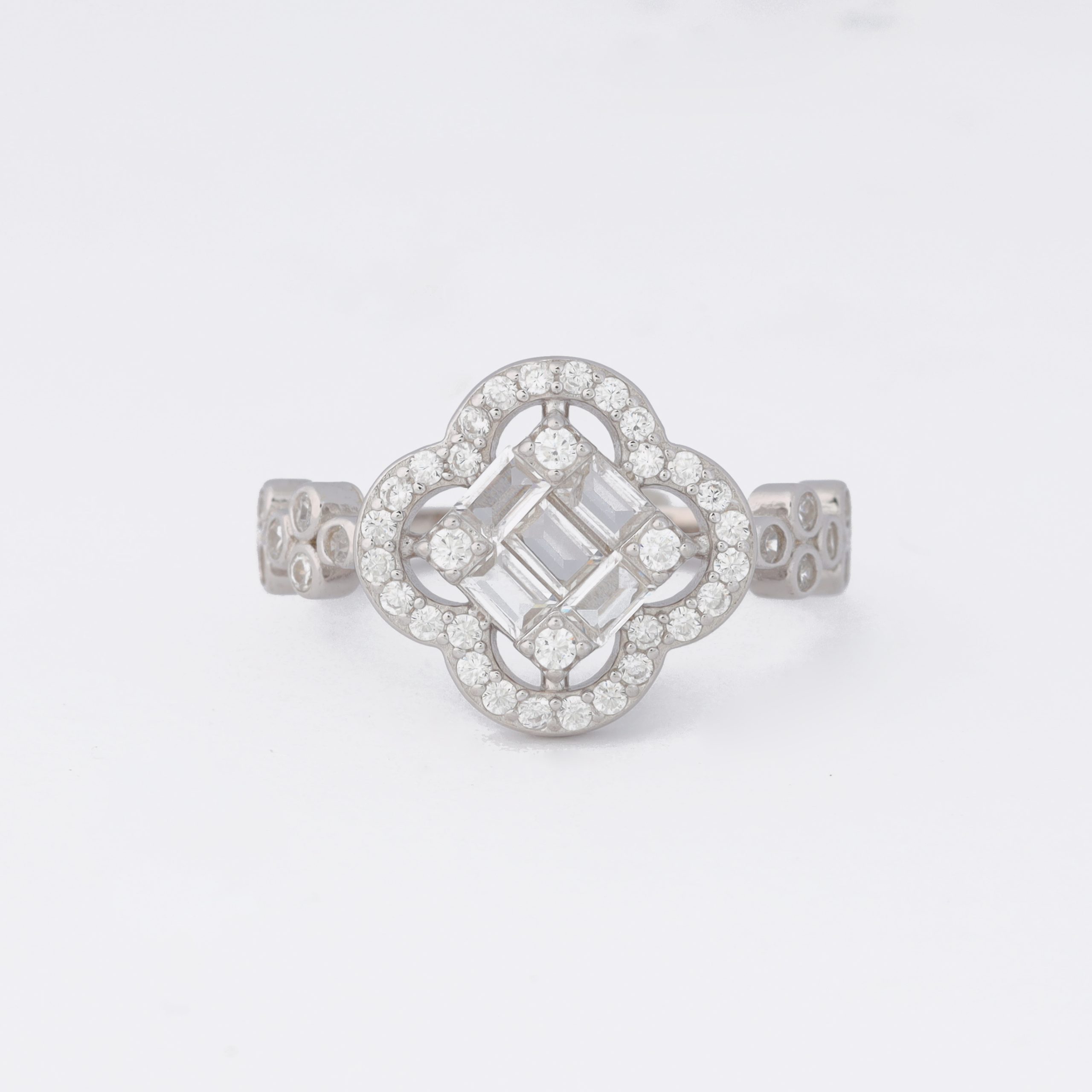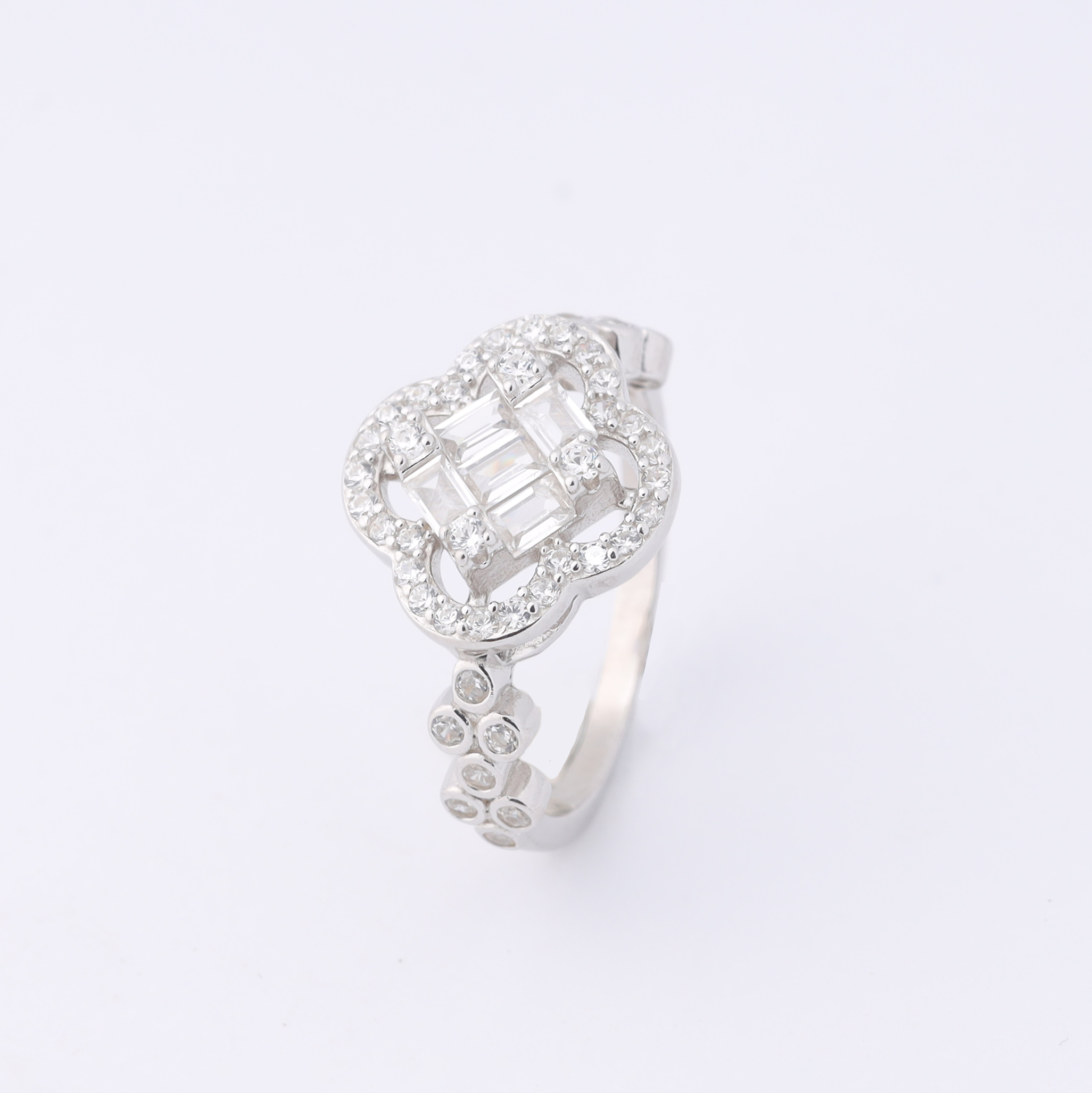 The ring is a sterling silver piece featuring a flower-shaped design set with zircon stones. The central motif contains baguette‑cut zircons arranged vertically inside the motif, surrounded by a halo of smaller round zircons that encircle the edge. Additional round zircons drop from the bottom of the flower motif in a small cluster, forming a decorative accent. The band is simple silver, crafted to hold the ornate zircon‑studded heart front.