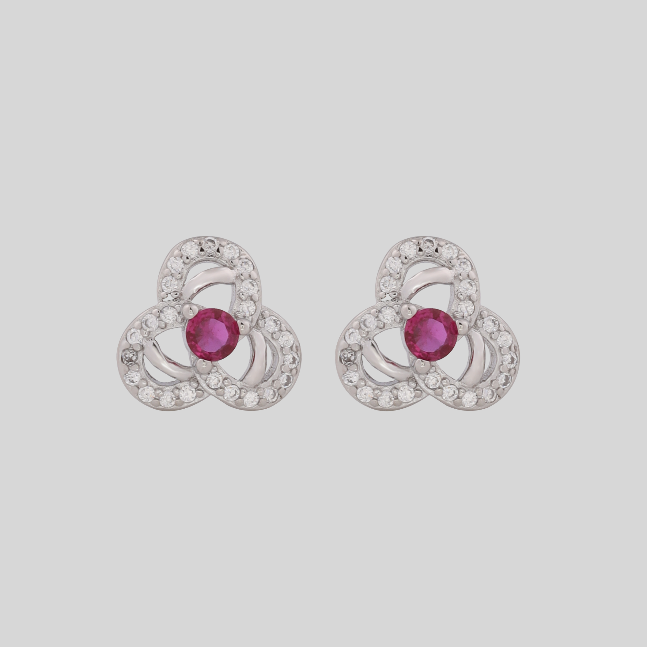 – The earrings are identical silver flower‑shaped studs, each with a pink center stone encircled by white accent stones, matching the pendant design.