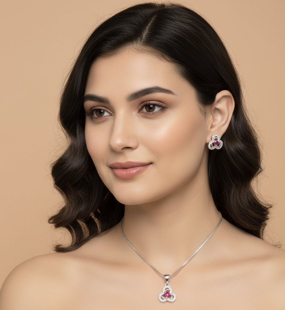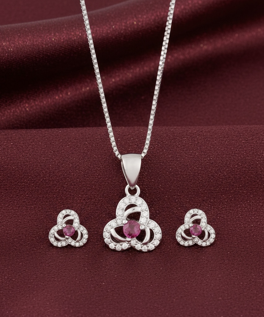 The pendant set is a sterling silver jewelry combo featuring a necklace with a matching pair of earrings.