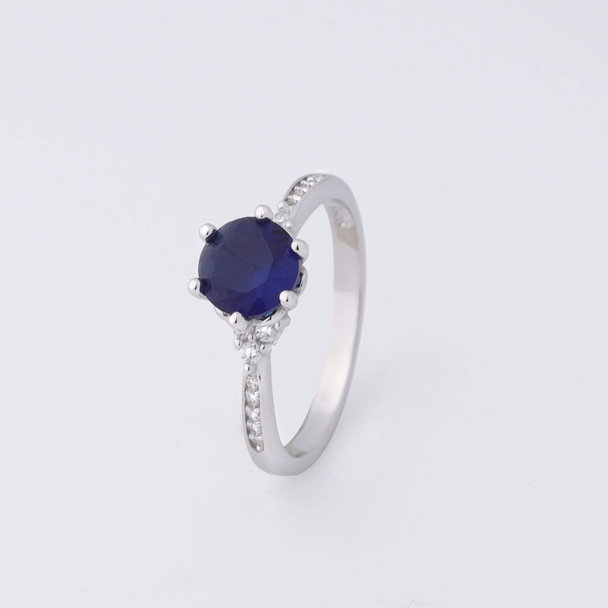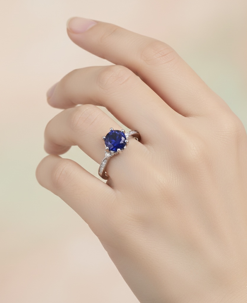 The ring is a sleek sterling silver (925) band set with a deep blue round gemstone– sapphire —in a six‑prong bezel setting at the center. Small, brilliant white accent stones (zirconia) line the shoulders of the band on either side of the center stone, adding sparkle. The design is versatile enough to shine at a party, date night, or everyday work wear, giving a classic yet modern look.