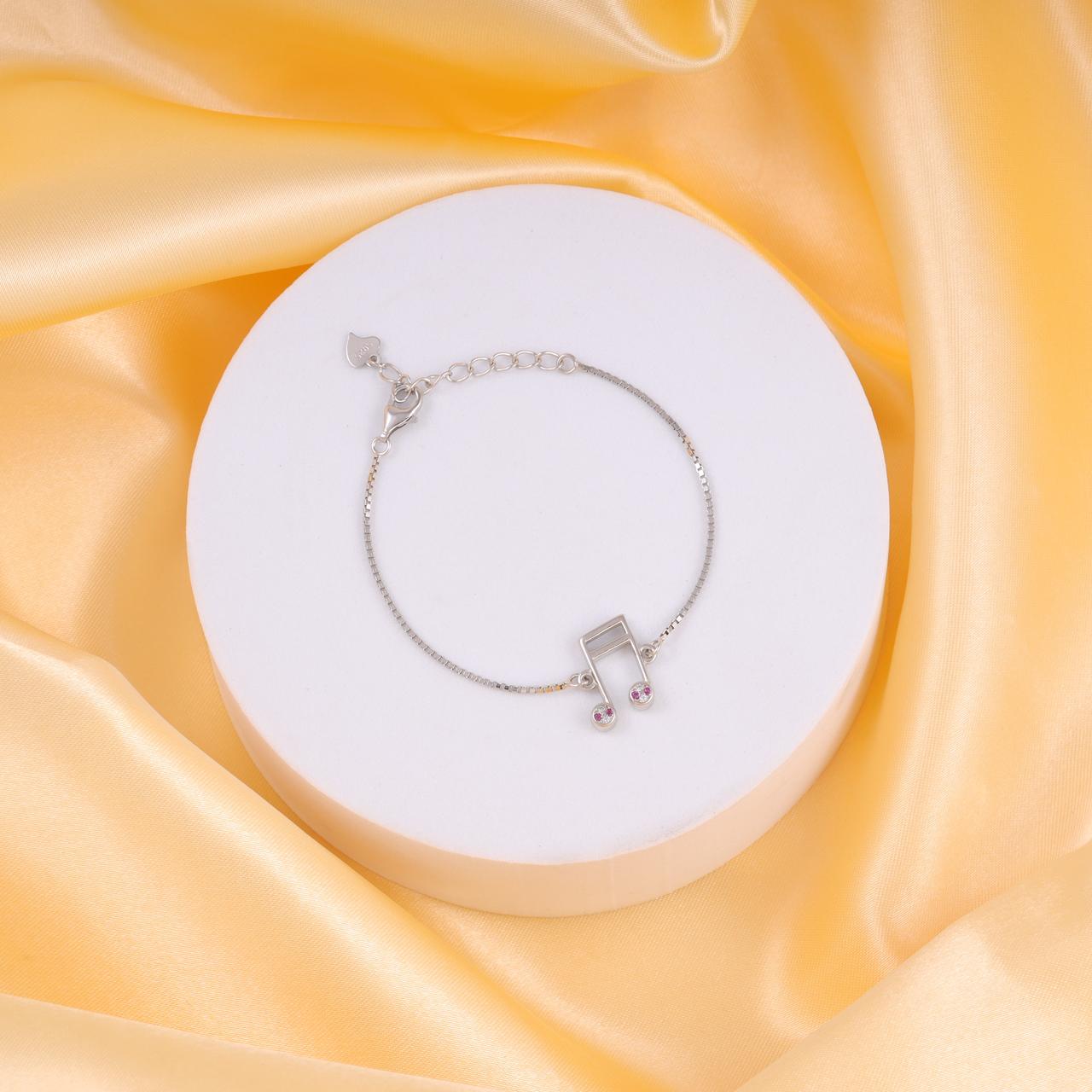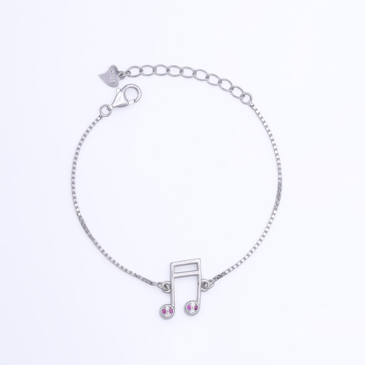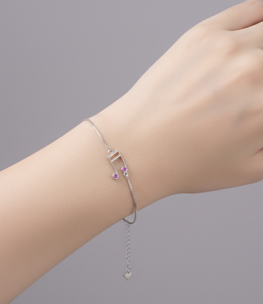 The bracelet is a sterling‑silver, adjustable chain bracelet featuring a central musical‑note charm (an eighth‑note) with two pink‑gemstone accents at its bottom ends. It has a claw‑type clasp and an extender chain for adjust the size.