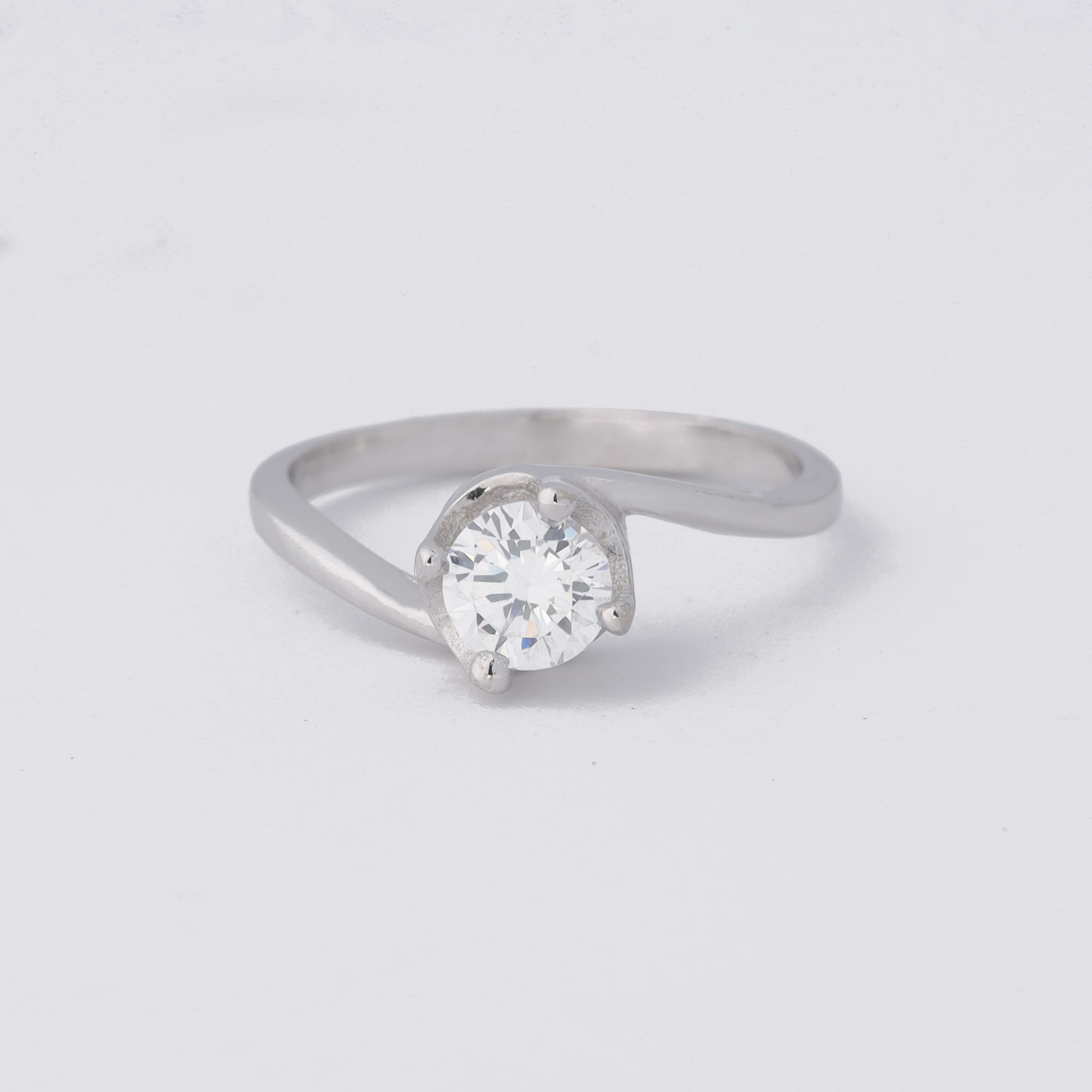 A sleek sterling‑silver ring with a round, brilliant‑cut zircon (or diamond‑like stone) set in a simple four‑prong bezel. The silver band is smooth and tapered, giving the piece a minimalist, elegant look that lets the center stone sparkle. The setting emphasizes the gem while keeping the overall design classic and understated.