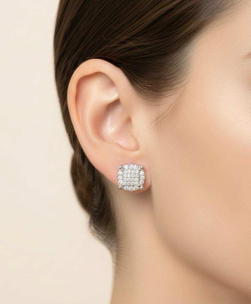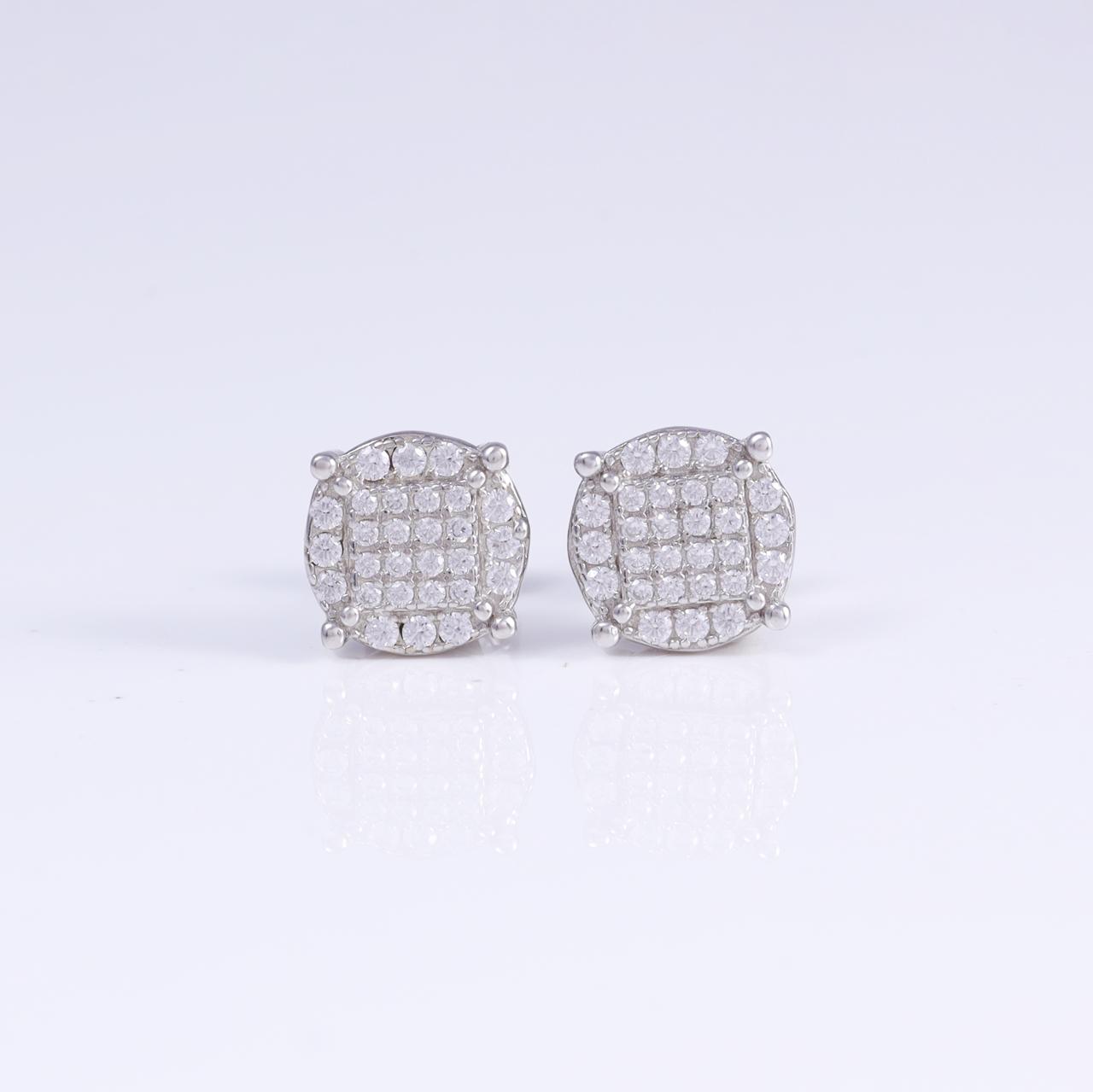These are stunning sterling‑silver stud earrings set with sparkling zircon stones arranged in a grid pattern that forms a round, pavé‑style design. The silver metal gives them a sleek, modern look while the zircon gems add brilliant shine, making the earrings versatile enough for a casual gathering, everyday work wear, or a glam date night.