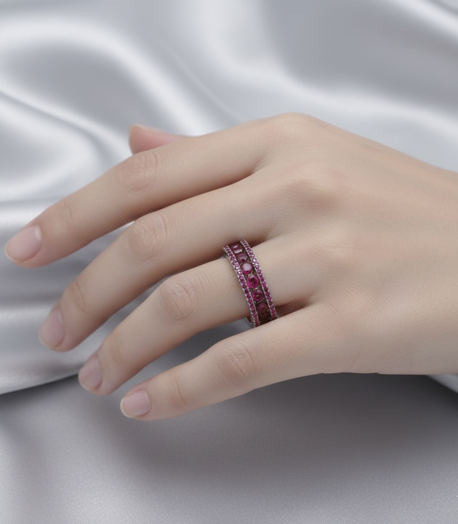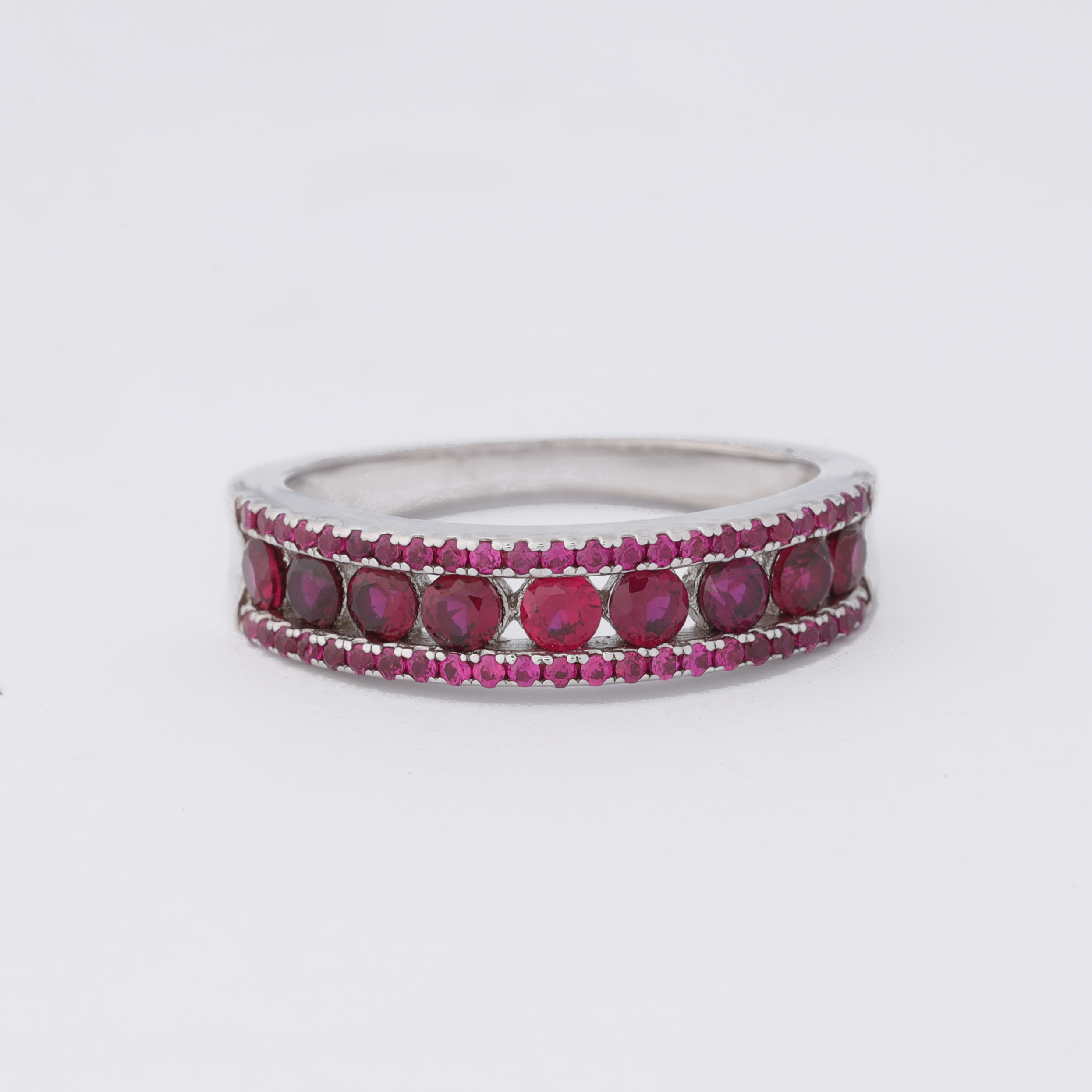 The ring is a sterling silver band set with two rows of ruby stones. The center row features larger, round rubies spaced evenly along the middle of the band, framed by a border of smaller pinkish‑ruby stones that run along both edges of the silver setting. The silver has a smooth, shiny finish that highlights the deep pink sparkle of the rubies.