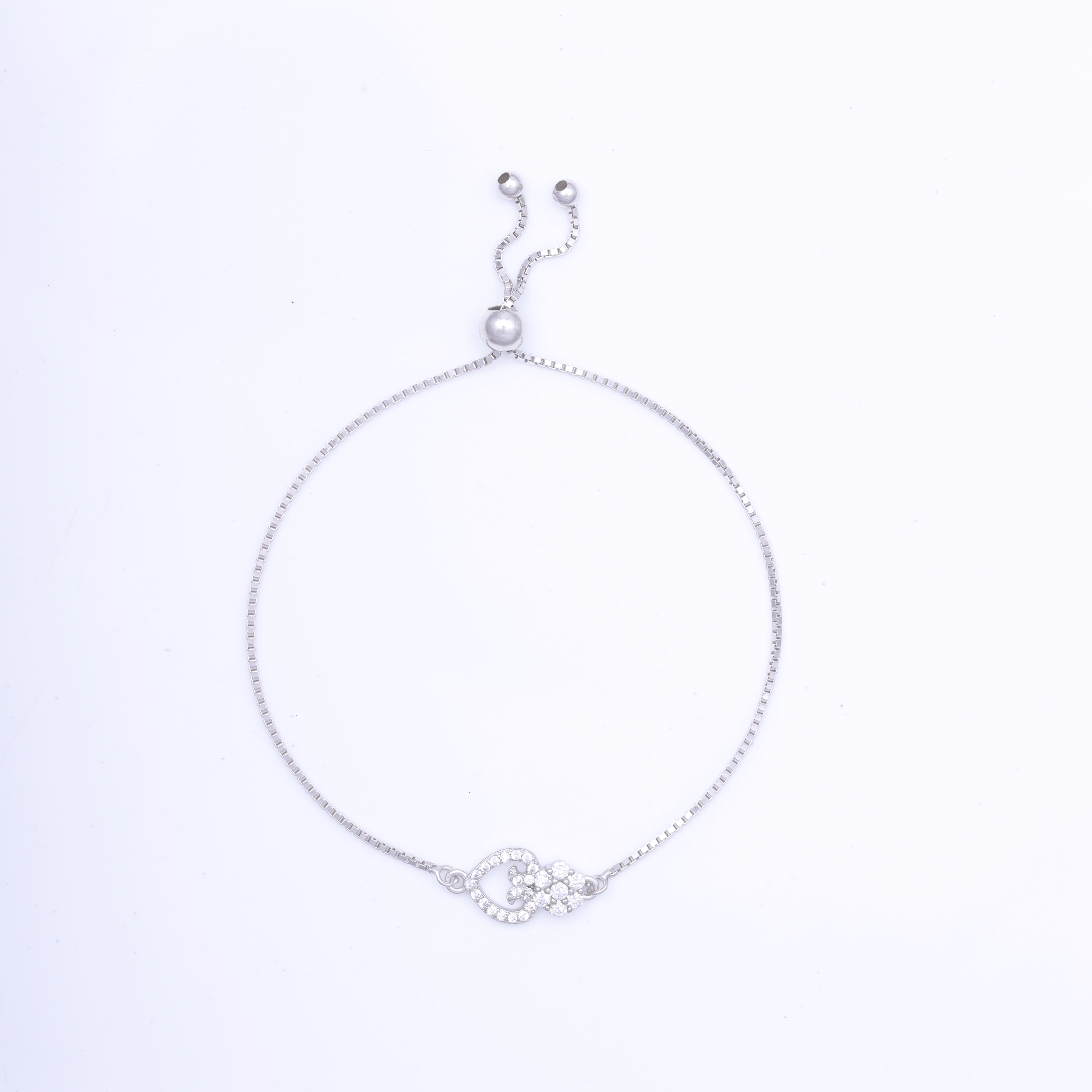 • This is a sterling‑silver bracelet with a delicate beaded chain that ends in an adjustable sliding clasp with two small silver beads. The focal piece is a silver‑framed charm shaped like an intertwined heart and flower motif, encrusted with clear zircon stones that sparkle around the design, giving it a diamond‑like shine. The bracelet is adjustable in size with the sliding chain‑adjuster.