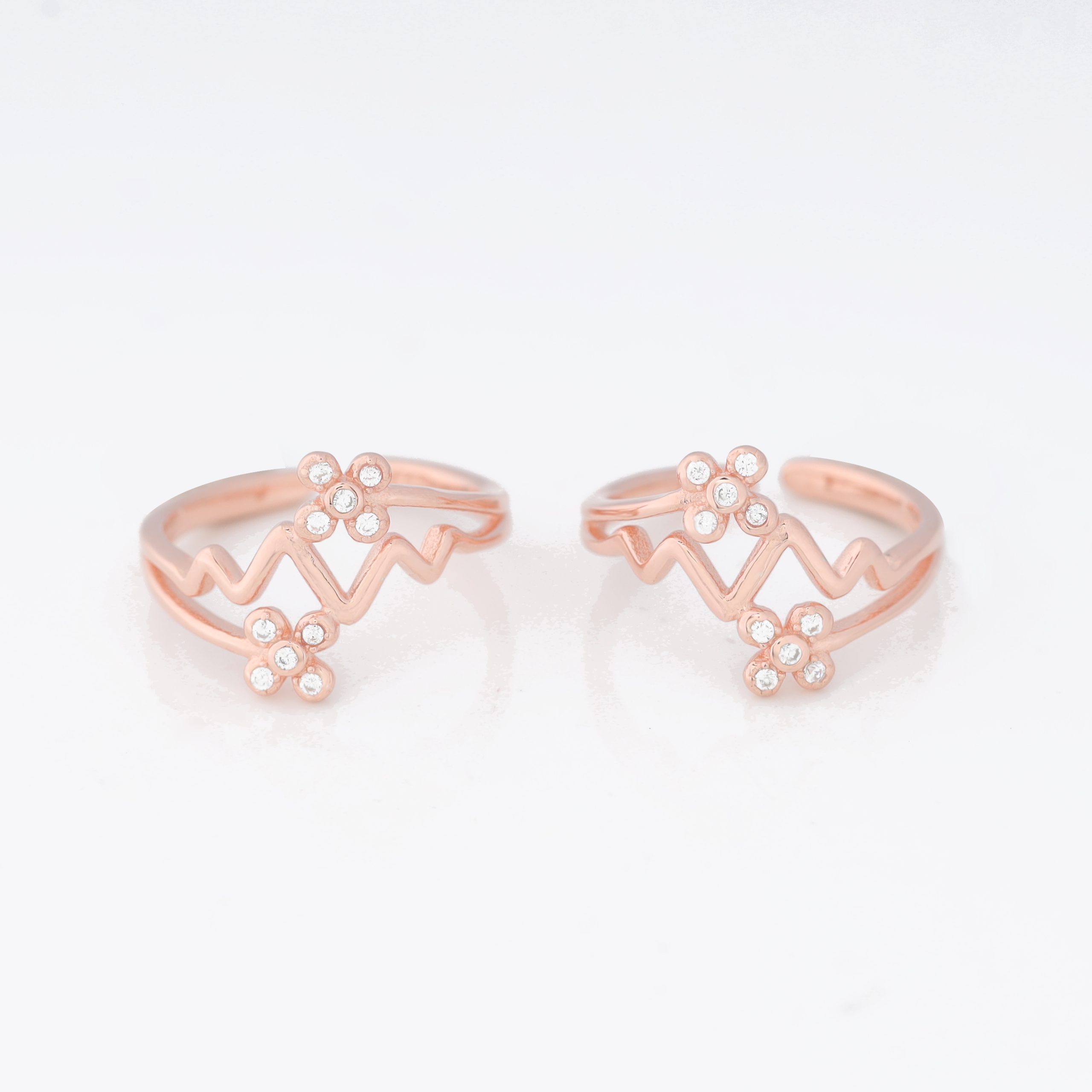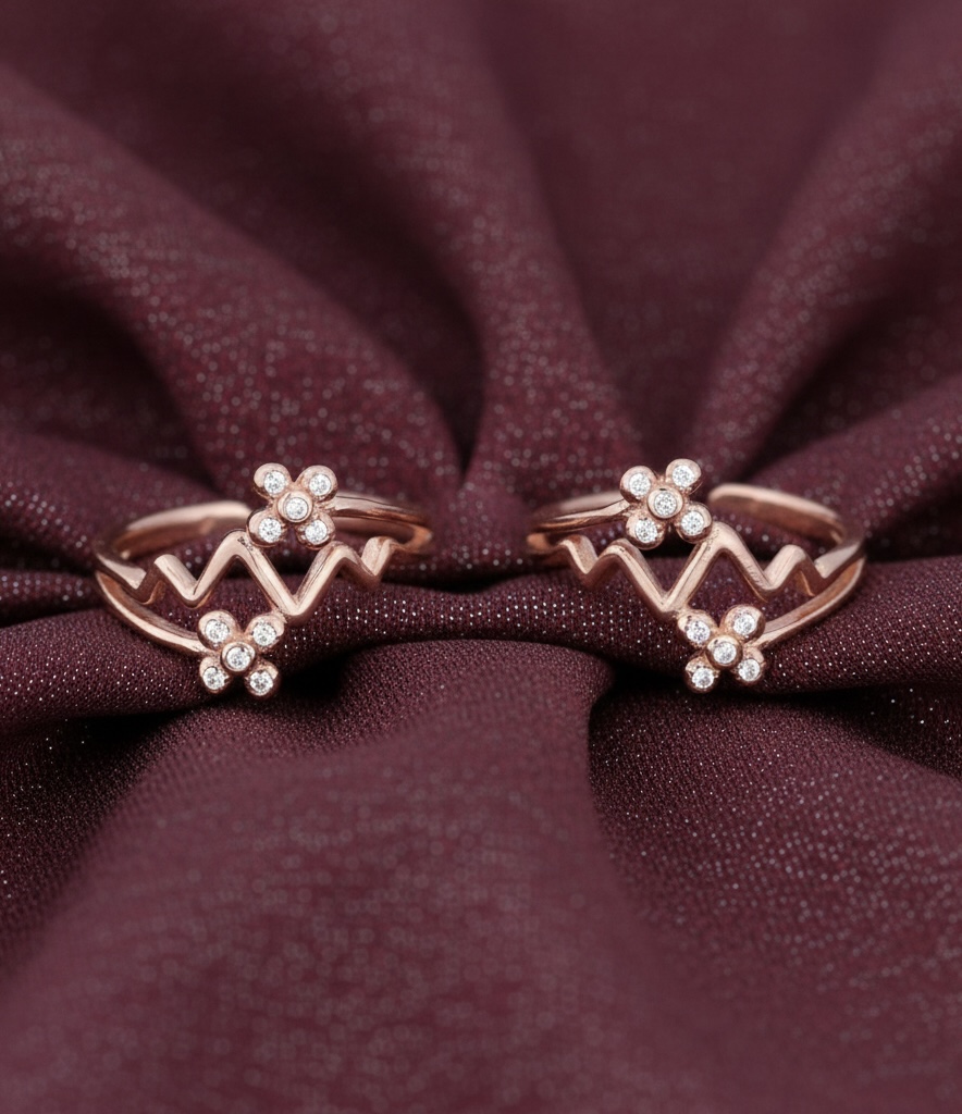 This rose‑gold colored toe rings , each shaped like a zig‑zag outline with a four‑petal flower motif set with tiny sparkling zirconia stones on the motif. The rings have an open‑back design that wraps around the toe for a delicate, adjustable fit.