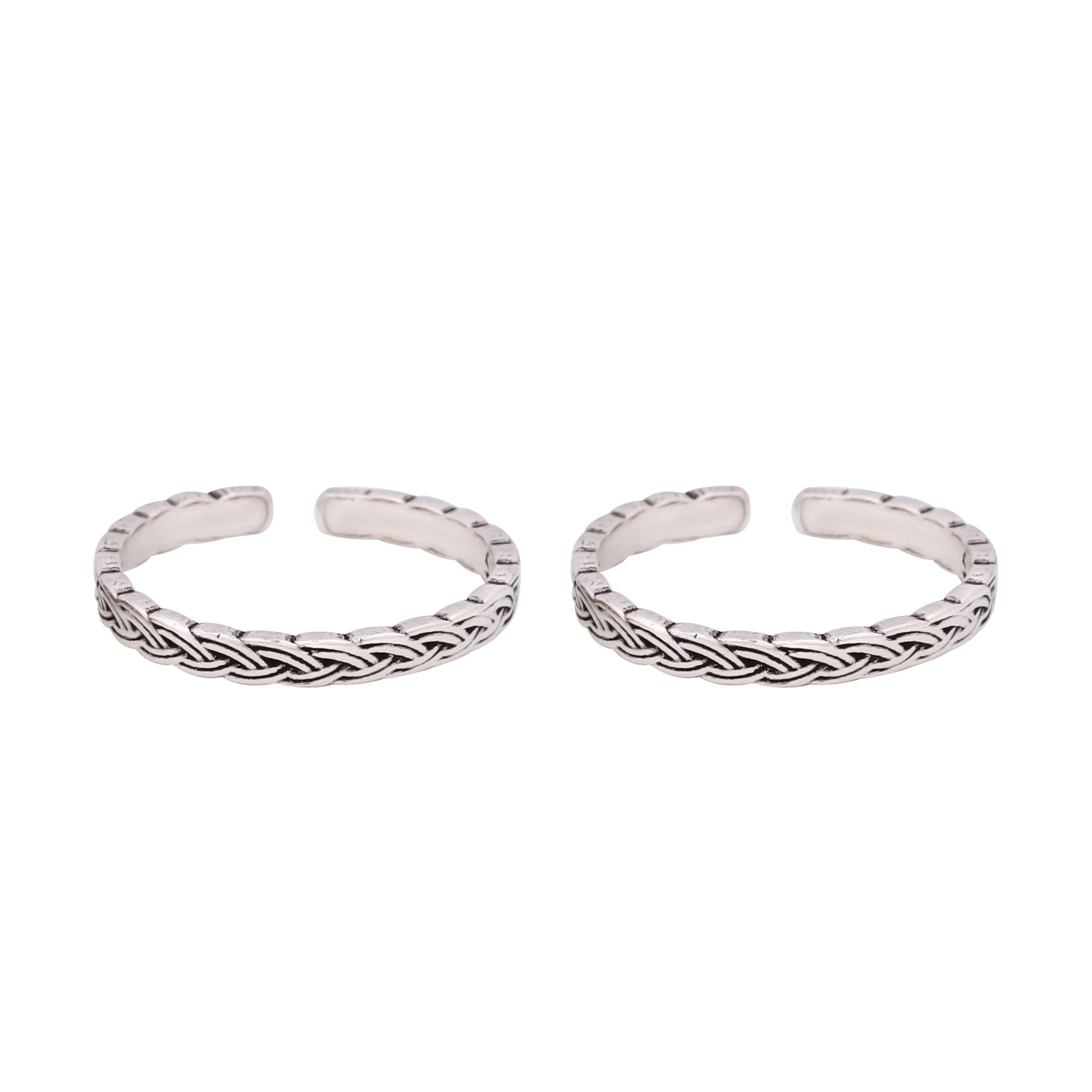 The toe‑ring is a sterling‑silver, oxidised cuff featuring an intricate Celtic‑knot weave pattern that gives it a textured, modern‑traditional vibe. The oxidation finish adds a subtle antique sheen, making the piece versatile enough to blend with everyday modern outfits or classic traditional attire, delivering a sleek, everyday‑wear look that feels both contemporary and timeless.