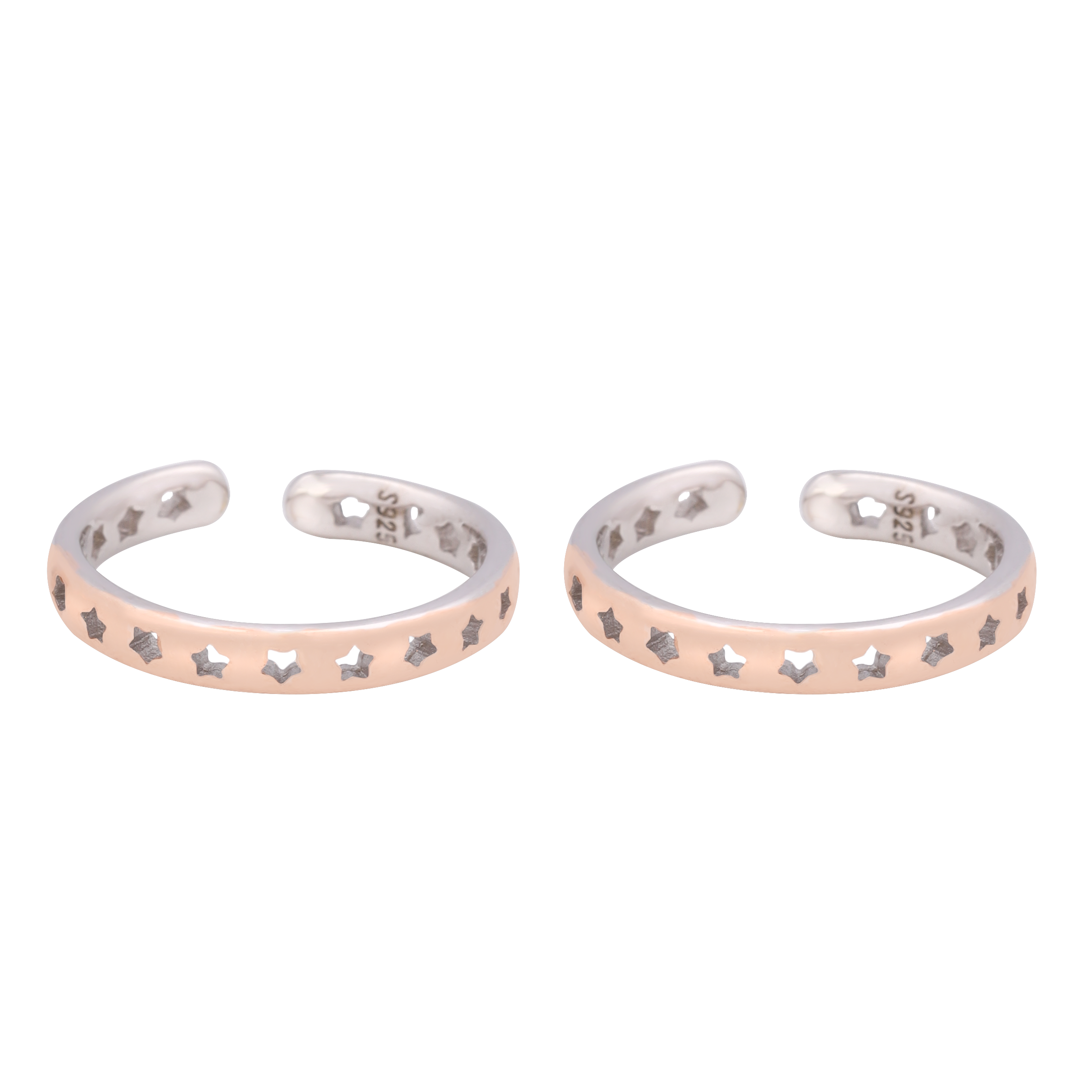 A pair of sterling‑silver toe rings with a rose‑gold plated outer surface. The band feature small cut‑out star patterns that give a textured, decorative look adding a stylish effect. It’s comfortable open‑crescent shape that slips onto the toe easily and stays secure.